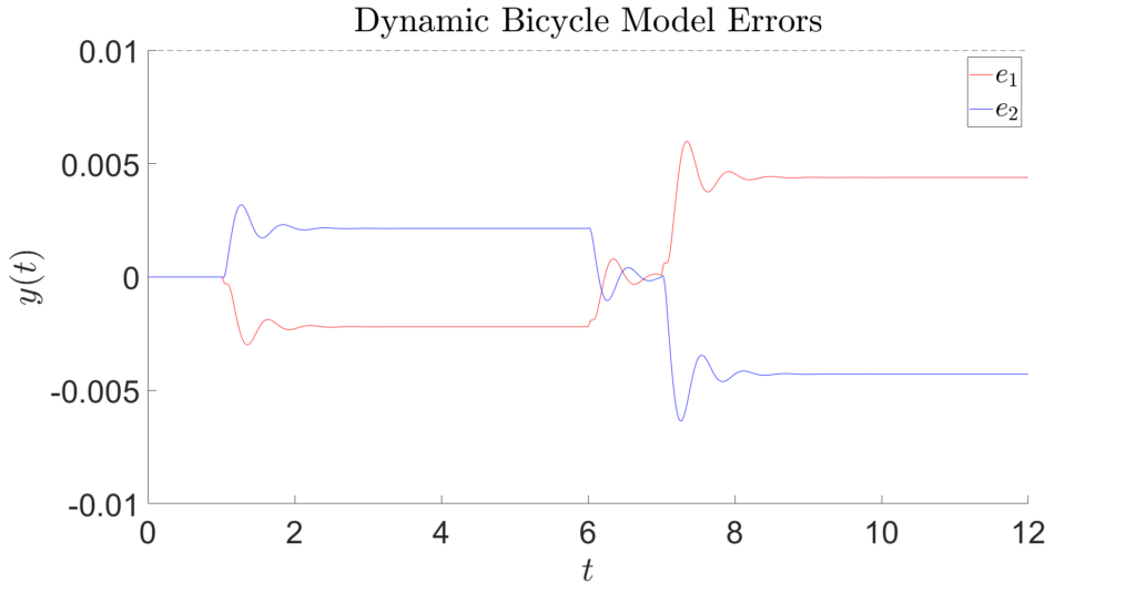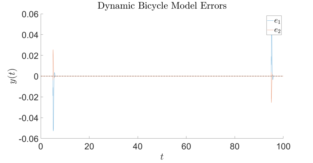 The following figures show the error dynamics of controlling the bicycle model with a steering angle and forward velocity.